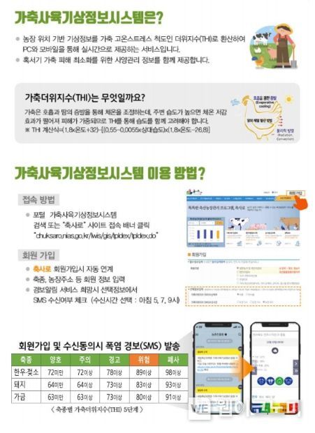 이 시스템에 접속하면, 휴대전화나 컴퓨터로 매일 가축더위지수를 확인할 수 있다. 이를 기반으로 기온 변화에 따른 맞춤형 사양관리가 가능해지고 고온 피해를 최소화할 수 있다. 농가에 정보 제공 차원에서 여름철 가축 관리 요령도 함께 안내한다.