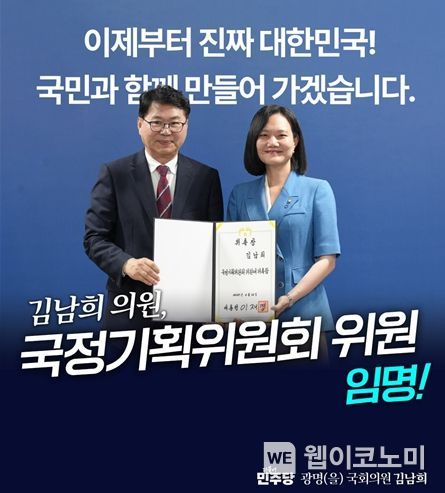 (웹이코노미) 더불어민주당 김남희 국회의원(경기 광명을)이 대통령직속 국정기획위원회 사회1분과 위원으로 공식 선임되어 임명장을 수여받았다.