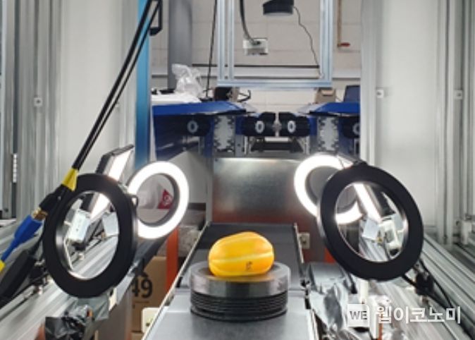 과일 3차원 영상 선별 기술은 컨베이어벨트로 참외를 이동시키며 중량을 측정하고, 다섯 대의 알지비(RGB)-디(D) 카메라를 이용해 과일을 촬영한 후 3차원 영상으로 복원해 품질을 판정한다.