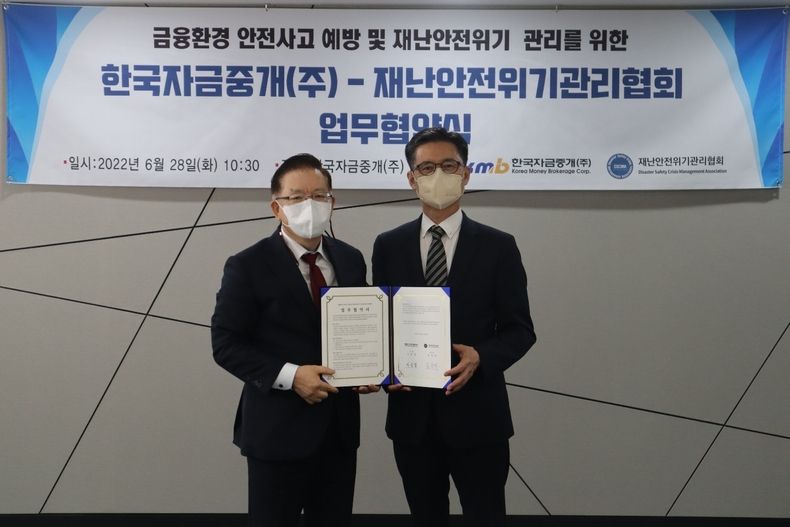 한편, 이날 협약식에는 재난안전위기관리협회 소속으로 김찬석 회장(청주대 교수)과 박기수 이사(한성대 교수)가, 한국자금중개(주)에서는 이승철 사장과 박종열 전무가 각각 참석했다.